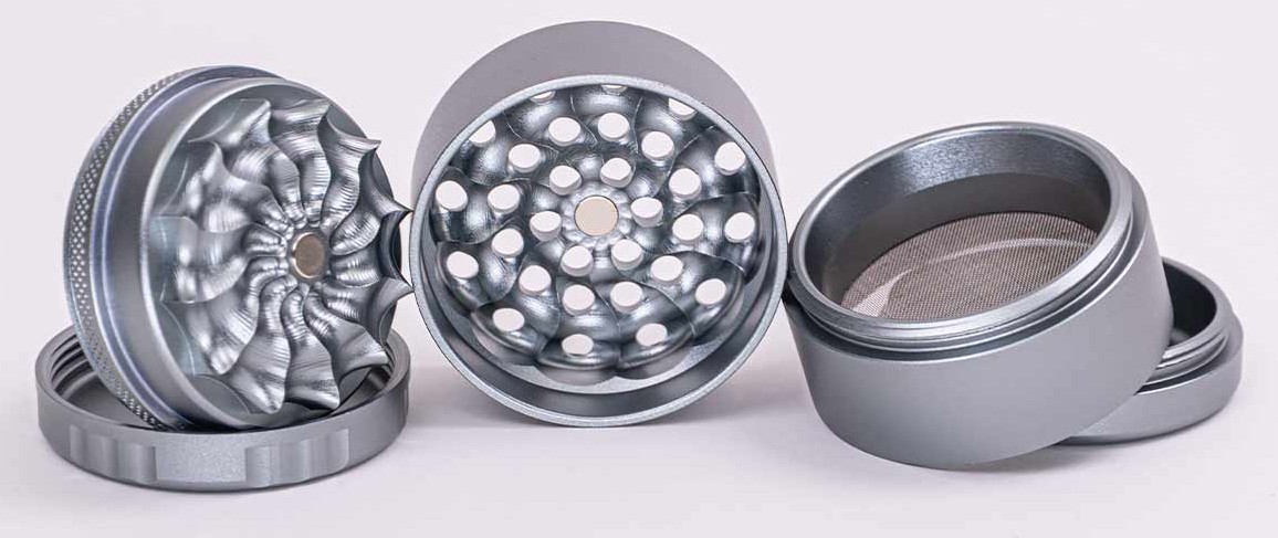 Flower Mühle Grau: Lässt die Weed Aromen optimal entfalten. Gleichzeitig entfällt das nervige Abkratzen von Material, das sich sonst zwischen langen Mahlzähnen festsetzt.