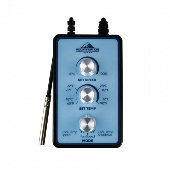 Zur vollständigen Kontrolle ist ein digitaler 3-Modus-Umgebungsregler im Lieferumfang enthalten. Ein Modus ermöglicht die manuelle Steuerung der Lüftergeschwindigkeit, während zwei thermostatgesteuerte Modi den Lüfter entweder abschalten oder seine Geschwindigkeit reduzieren, wenn die Raumtemperatur unter die eingestellte Temperatur fällt.