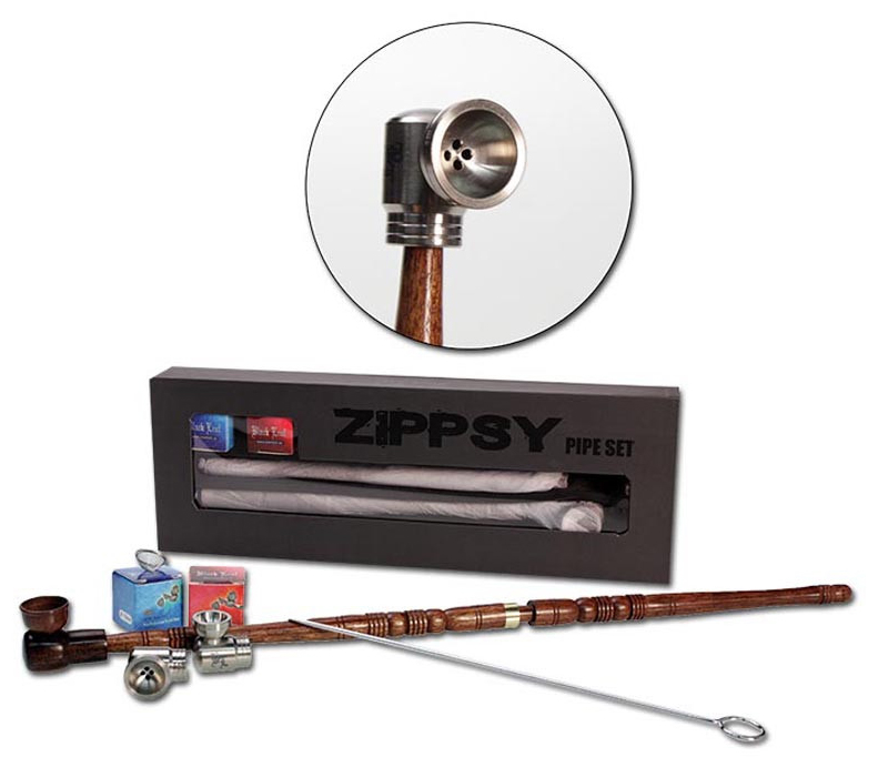 Das Zippsy Pfeifen-Set mit Holzkopf und 2 Metallköpfen besteht aus einer zweiteiligen, 410mm langen, gedrechselten Holzpfeife aus Rosenholz, einem Holzkopf, zwei verschieden grossen Metallköpfen von Black Leaf, passenden Schüsselsieben und einem Reinigungsset.