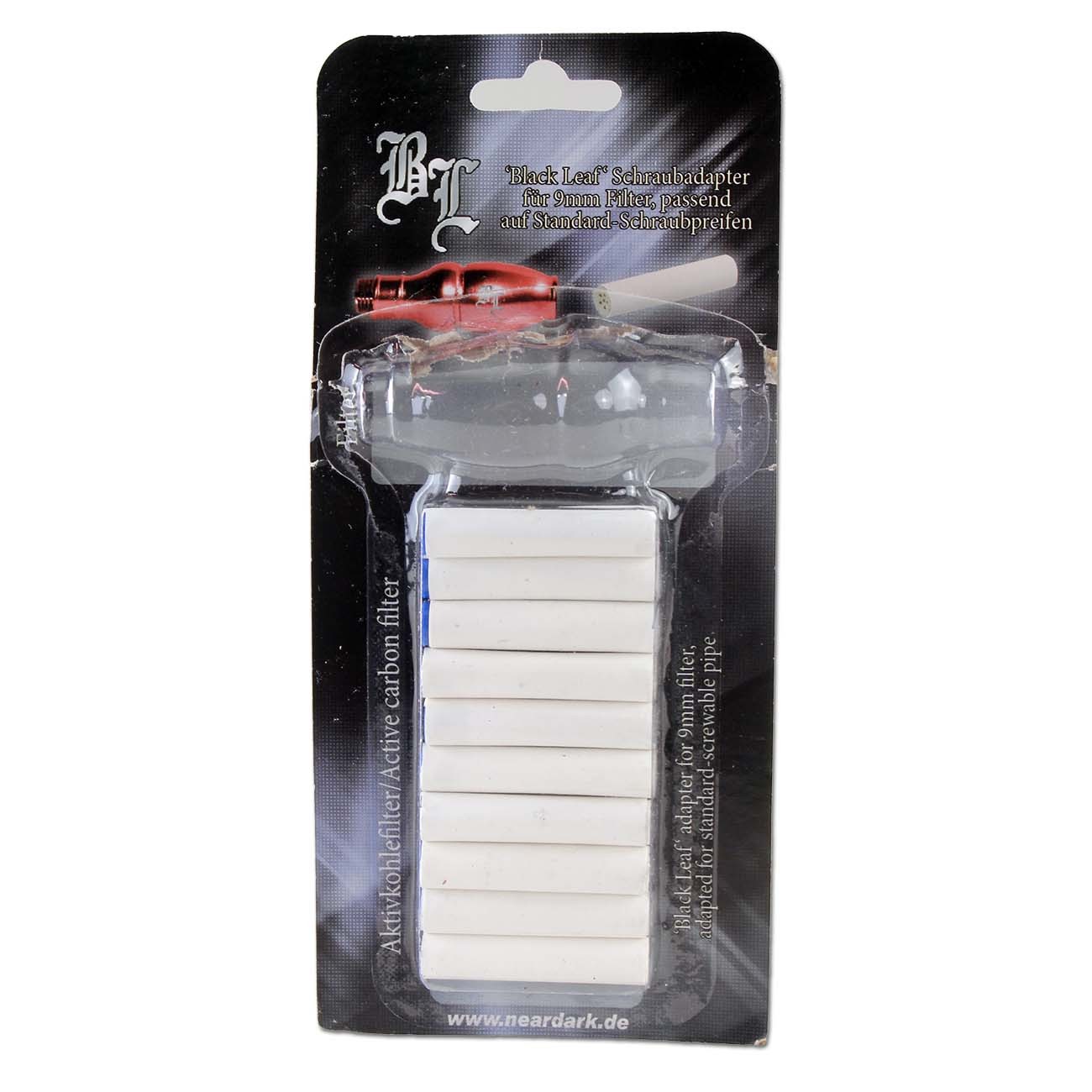 Es enthält eine hochwertige Purpfeife aus Metall mit Schraubgewinde, einen passenden Black Leaf Schraubadapter für 9 mm Aktivkohlefilter sowie 10 Aktivkohlefilter zum sofortigen Einsatz.